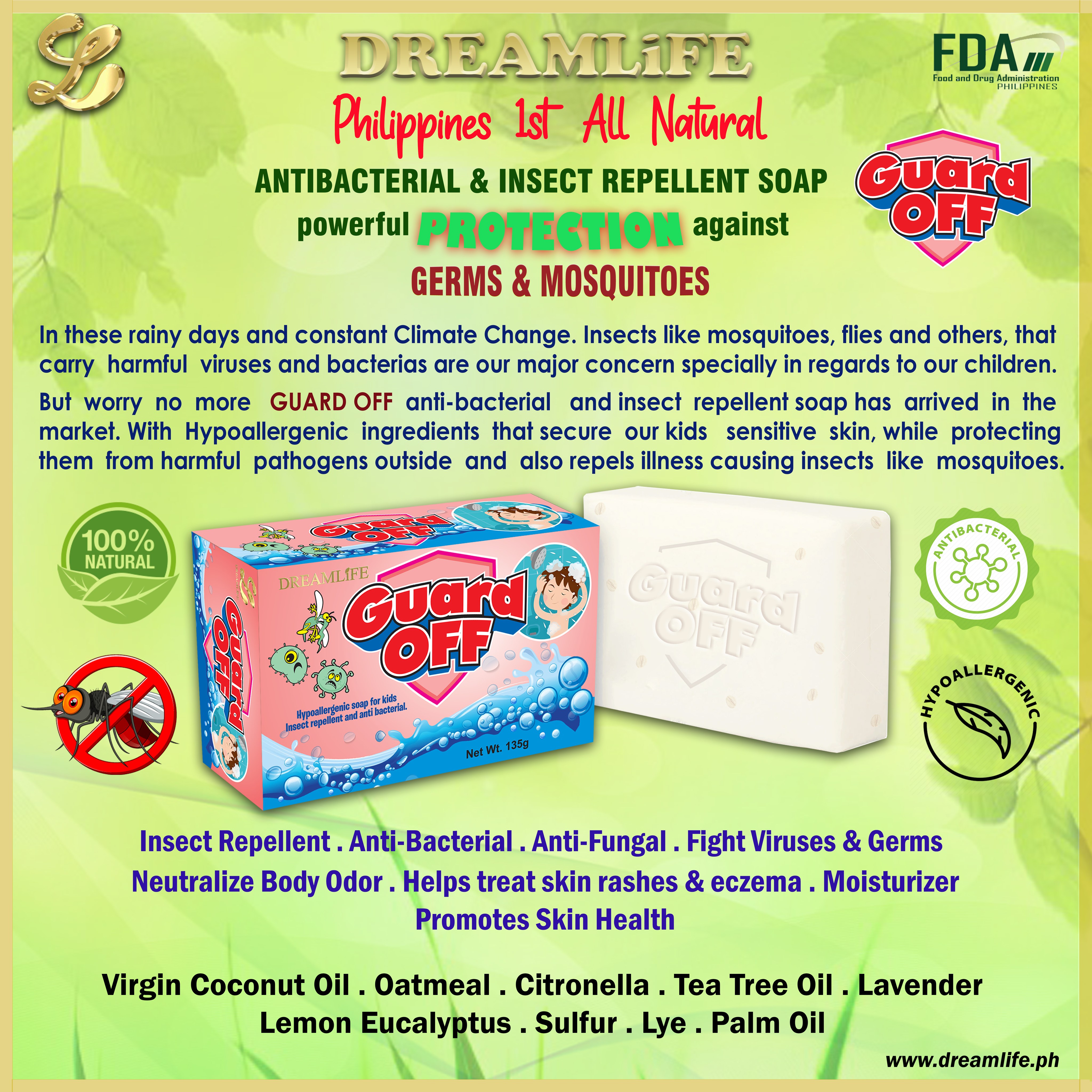 In these rainy days and constant climate change. Insects like mosquitoes, harmful viruses and bacterias are our major concern speacially in regards to our children. But worry no more GUARD OFF anti-bacterial and insect repellent soap has arrived in the market. With Hypoallergenic ingredients that secure our kids sensitive skin while protecting them fromharmful pathogens outside and also repels illness causing insects like mosquitoes. Made from natures best ingredients like Virgin Coconut Oil Citronella, Tea Tree Oil Lavender, Lemon Eucalyptus, Sulfur ,Oatmeland other natural ingredients that promotes skin health while giving it a shield of protection.
